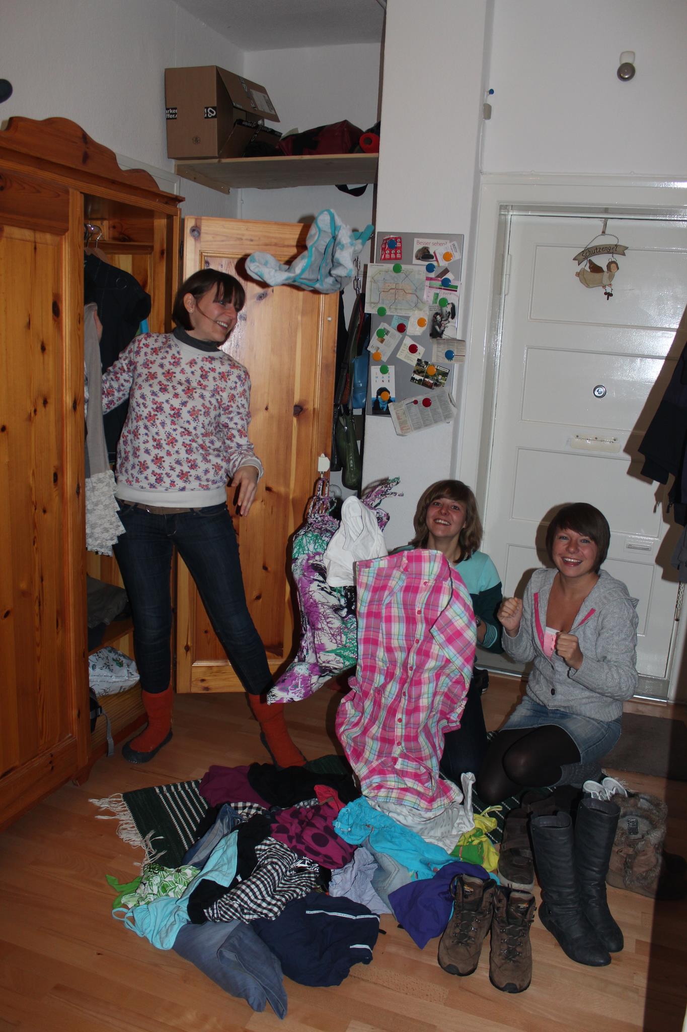 Wird das noch gebraucht? Anna (l.) und Lydia Appenheimer und Freundin Anett Grellmann (r.) durchforsten derzeit ihre Kleiderschränke. Worauf sie verzichten können, nehmen sie mit zur Tausch- Party. Foto: privat